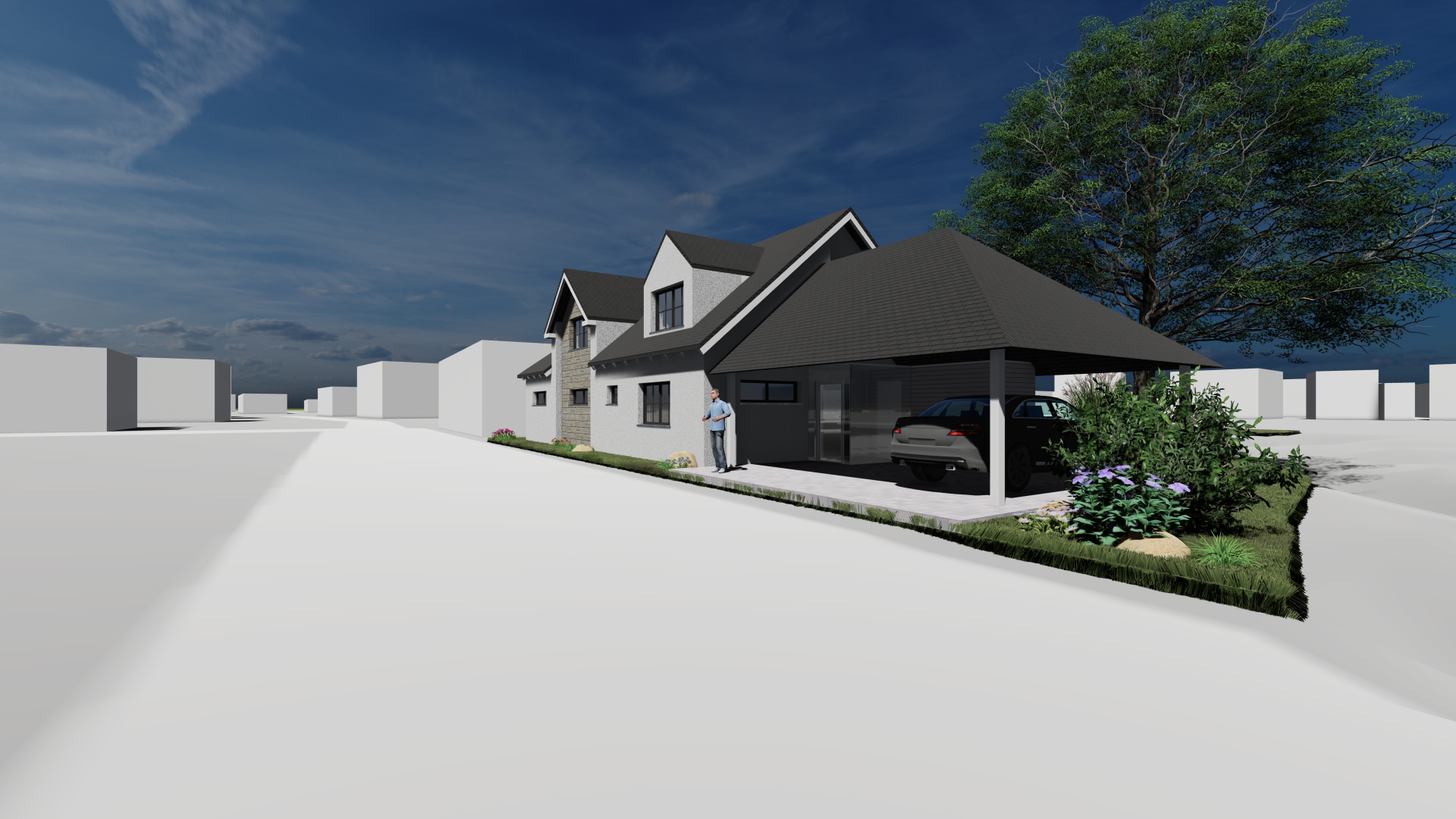 Entwurf eines Einfamilienhauses mit einer Galerie als 2. Obergeschoss als lichtdurchflutete Eleganz.
